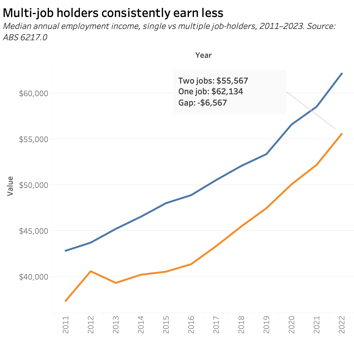 More revealing is what those second jobs actually pay. ABS income data shows that multiple job-holders consistently earn less than single job-holders, about $55,500 versus $62,100 in median annual income as of 2022 to 2023.