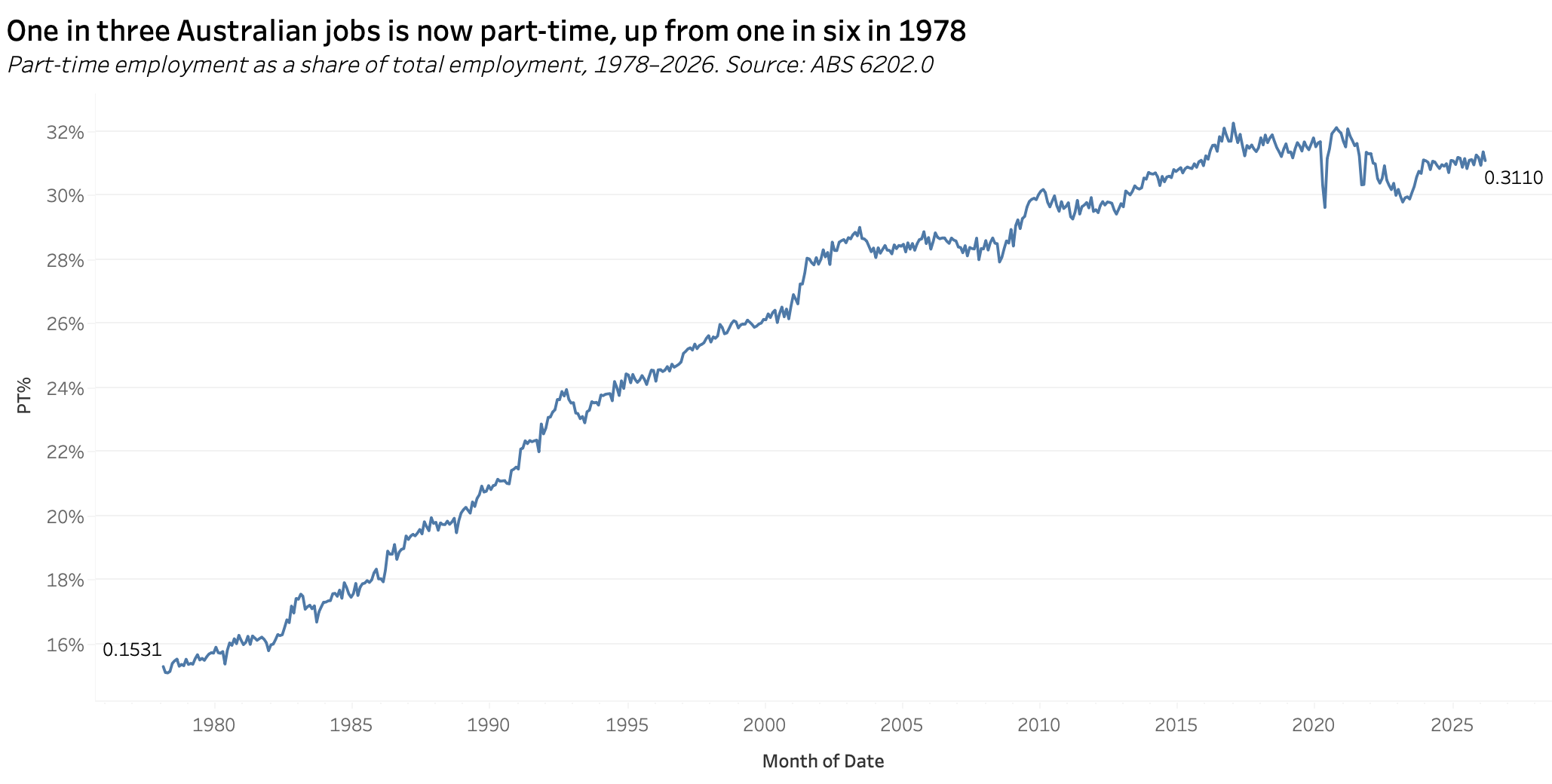 In 1978, about one in six Australian jobs was part-time. Today, it is closer to one in three. This is a structural transformation driven by three forces that reshaped the Australian economy: