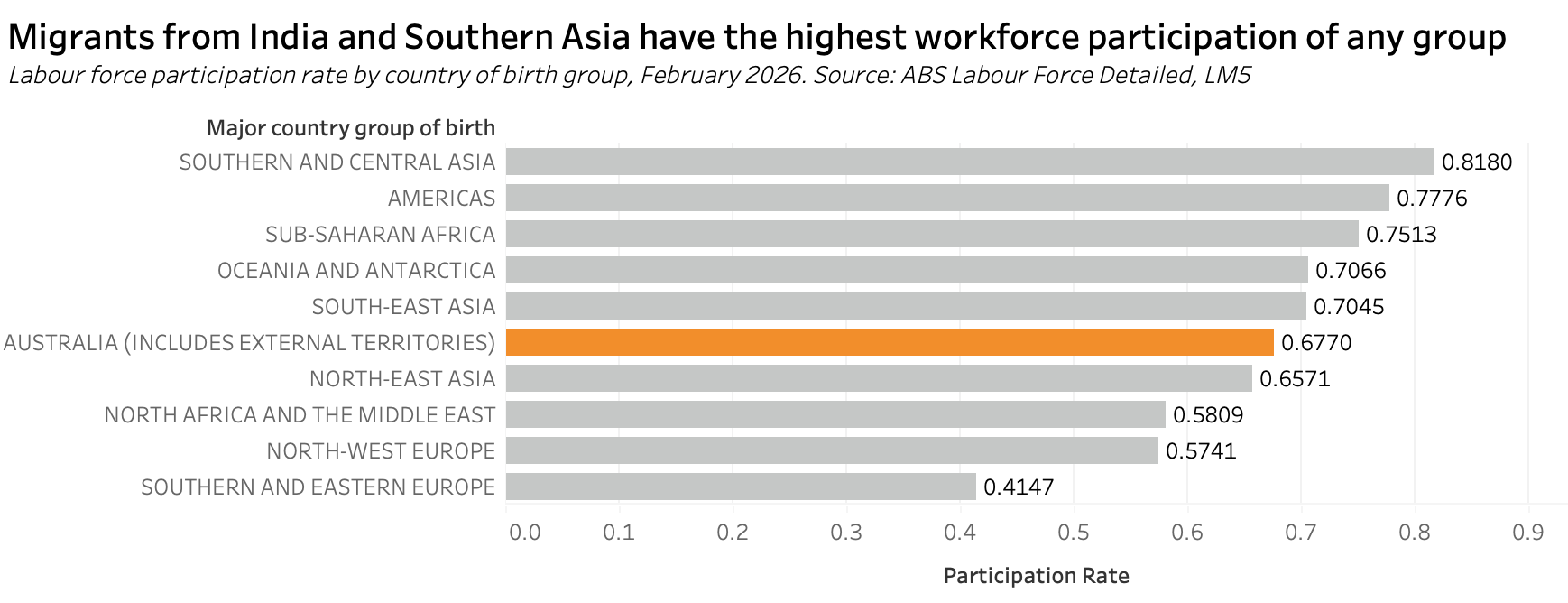 Migrants from India and Southern Asia have the highest workforce participation of any group at 81.8%, fourteen percentage points above the Australian-born rate of 67.7%. Workers born in South-East Asia, Sub-Saharan Africa, the Americas, and New Zealand also participate at higher rates than those born in Australia.