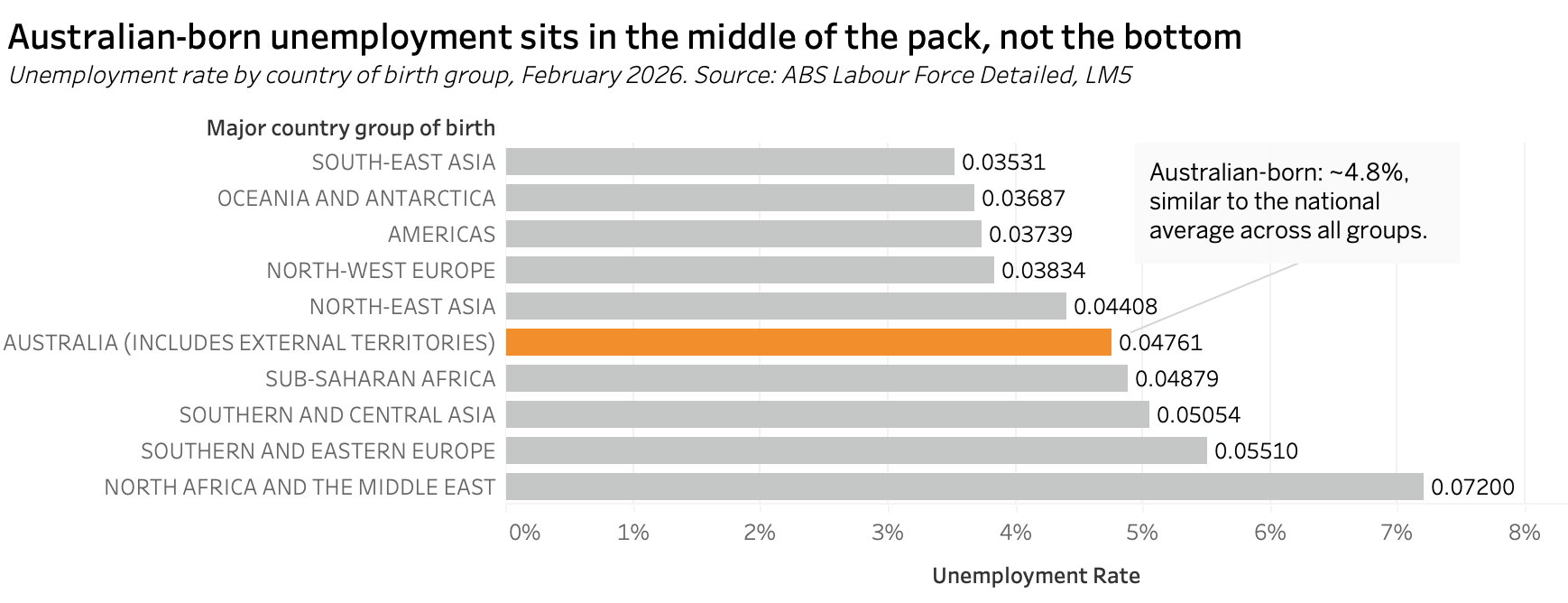 Australian-born workers have an unemployment rate of 4.8%, which places them roughly in the middle of all groups.