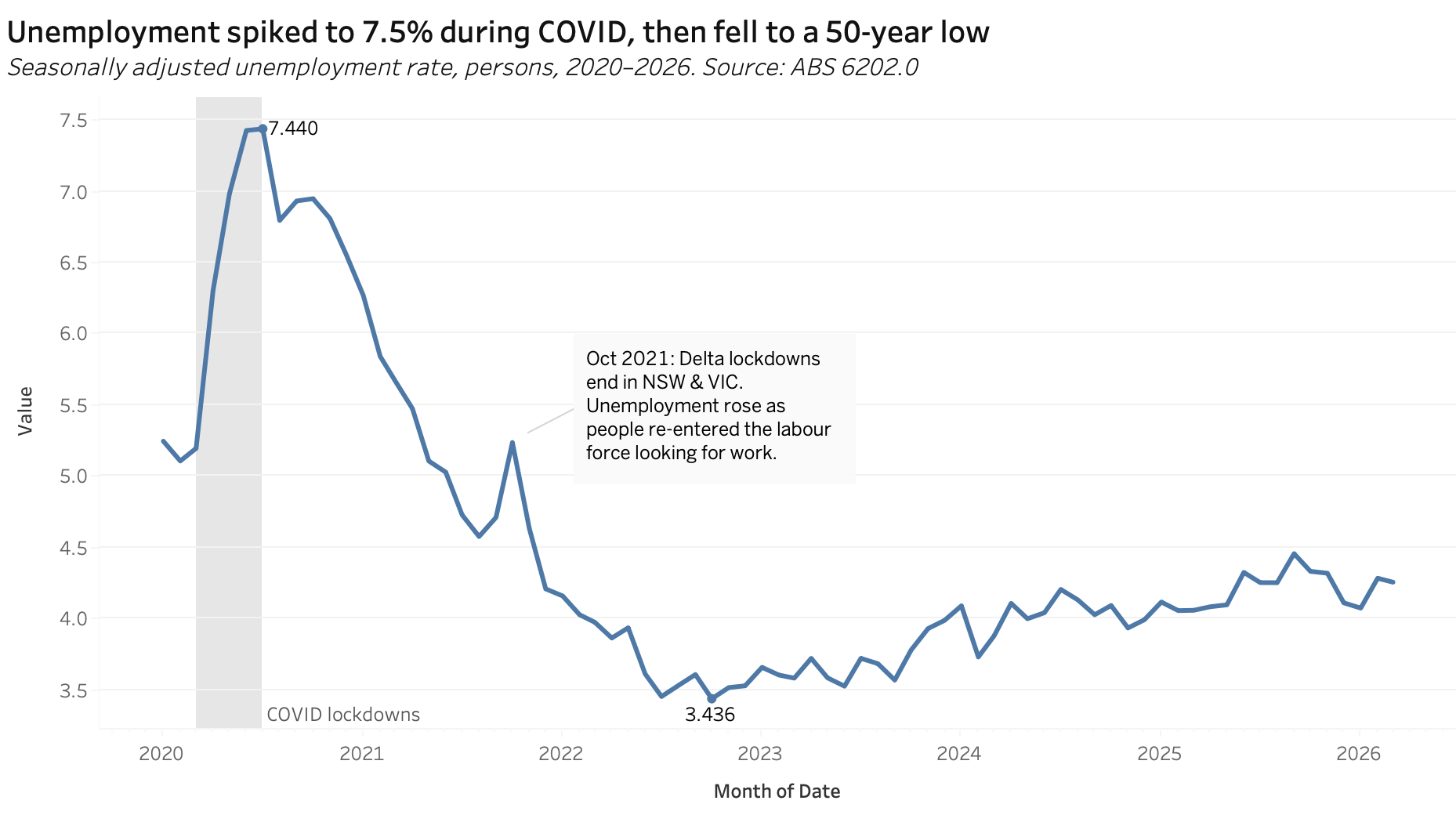 During the first wave and strongest COVID hit, in April 2020, unemployment spiked to 7.4% as the first national lockdown shut down large parts of the economy. By late 2022, it had fallen to 3.4%, a 50-year low, well below where it sat before the pandemic. As of March 2026, it sits at around 4.3%.